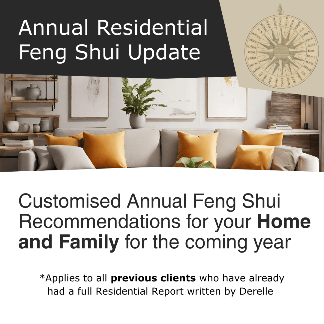For clients who have already had an on-site or off-site residential feng shui report from Derelle, you can order an annual update to see where the annual energy influences will affect your home and property and how to protect and enhance these energy influences, as well as astrological updates for the entire family. Please let Derelle know the year and month of your original feng shui report, so she can refer to the floor plan, compass demarcation and birth dates.